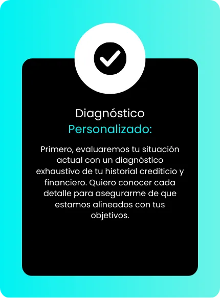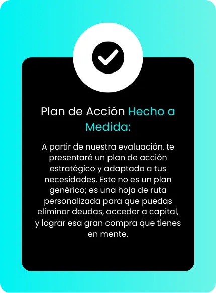 Desarrollaremos un plan de acción específico para ti, ya sea que busques mejorar tu puntaje de crédito, reparar tu historial, o acceder a financiamiento para tus proyectos